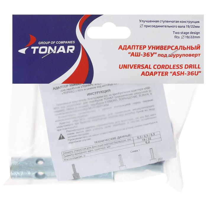 Универсальный адаптер АШ-36У под шуруповёрт подходит для шнеков ледобуров «ТОРНАДО-М2», BURAN, ICEBERG, а также шнеков под мотобур MOTOSHTORM. При использовании удлинителя УА-400 адаптер можно присоединить к шнекам ледобуров «ТОНАР» и Helios.