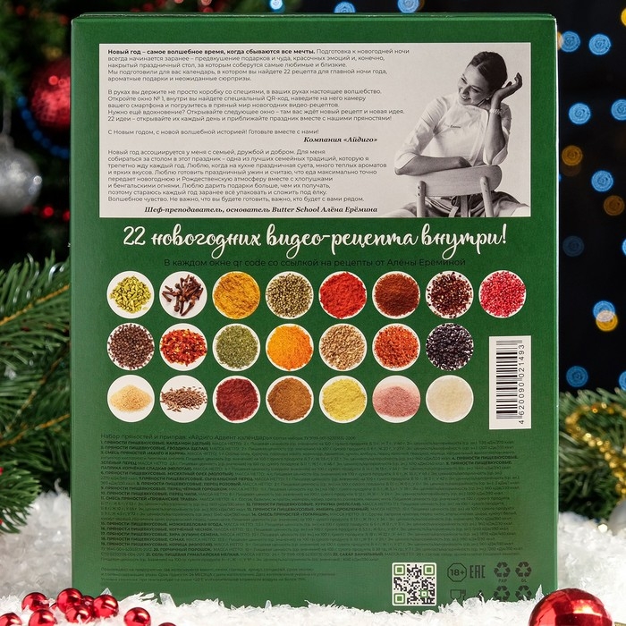 Новогодний адвент-календарь содержит 22 пряности и приправы в стеклянных многоразовых баночках. 22 баночки с ароматными специями и пряностями — это 22 идеи для Нового года. Ведь наш адвент календарь дополняют 22 видео-рецепта восхитительных блюд и десертов для новогодней ночи от шеф-повара. Найти рецепты можно будет по QR-кодам, спрятанным за окошками.