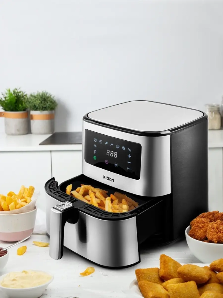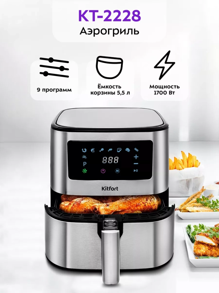Современный аэрогриль Kitfort КТ-2228 интересен не только стильным дизайном: он может использоваться как аэрогриль, а также как аэрофритюрница и духовка.