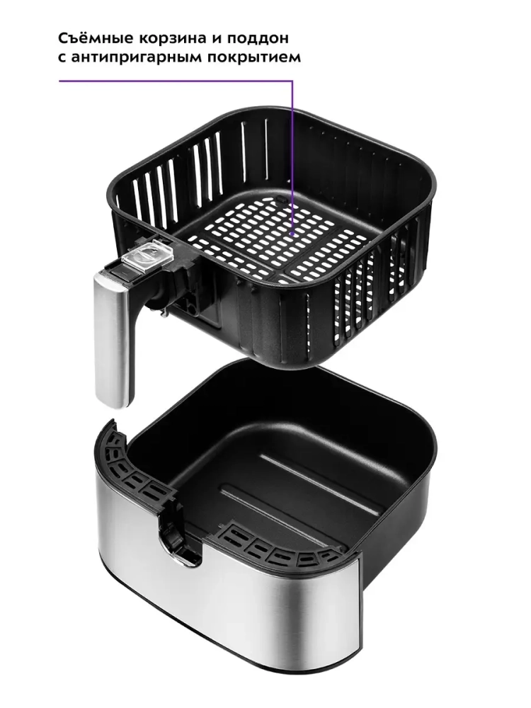 Аэрогриль Китфорт оснащен сенсорным управлением, он имеет 9 автоматических программ и программу с ручными настройками. Программы позволяют использовать готовые шаблоны настроек, разработанные специально под конкретные блюда, поэтому вам не придется контролировать процесс приготовления лично — аэрогриль сам выберет необходимые параметры своей работы. На дисплее попеременно отображаются температура и время приготовления. Продукты готовятся в специальной корзине, вставленной в поддон. И корзина и поддон с антипригарным покрытием. По окончании приготовления аэрогриль автоматически отключается. Поддон с корзиной легко вынимаются и моются.