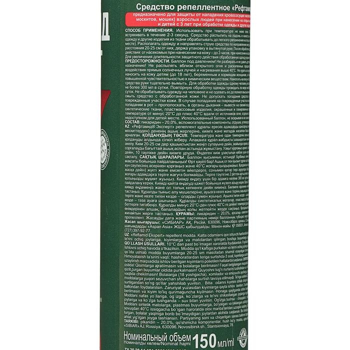 Рефтамид обеспечивает надёжную защиту от комаров и других кровососущих насекомых. Содержит высокоэффективный действующий компонент, сохраняет своё действие в течении 4 часов. Средство наносится на одежду и открытые части тела. Надежно защищает от комаров и работает в любой местности. Состав: Пикаридин - 20,0%, вспомогательные компоненты, отдушка, углеводородный пропеллент