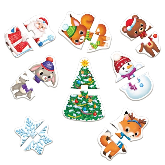 - Внутри красочной коробочки вы найдёте 8 макси-пазлов и 3 книги новогодней тематики.