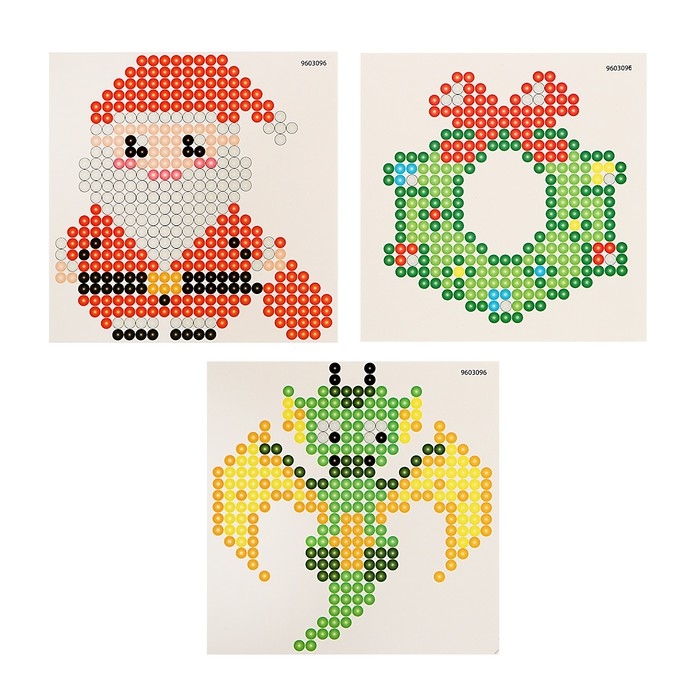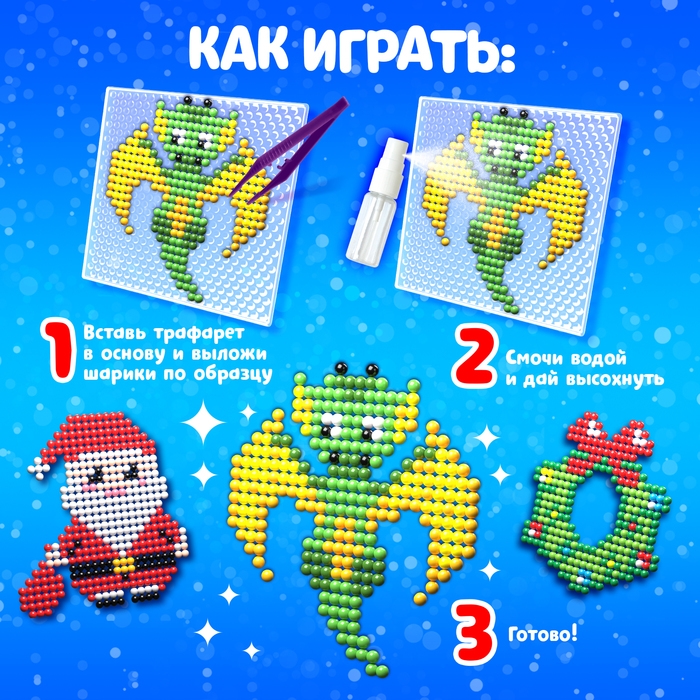 - В комплект входят бусинки, площадка для сборки фигурок, пинцет, баночка-распылитель и трафареты для сборки.