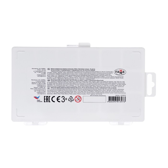 Акварель безопасна для детей. Удобный пластиковый пенал, крышка плотно фиксируется и служит палитрой для смешивания красок.