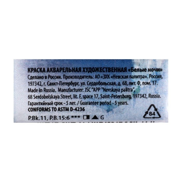 Акварельная краска серии "Белые ночи" обладает высокой концентрацией цветового тона, сохраняющейся даже при разбавлении большим количеством воды, что обеспечивается высокой концентрацией пигмента и тонкостью его перетира.