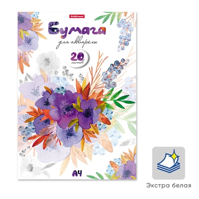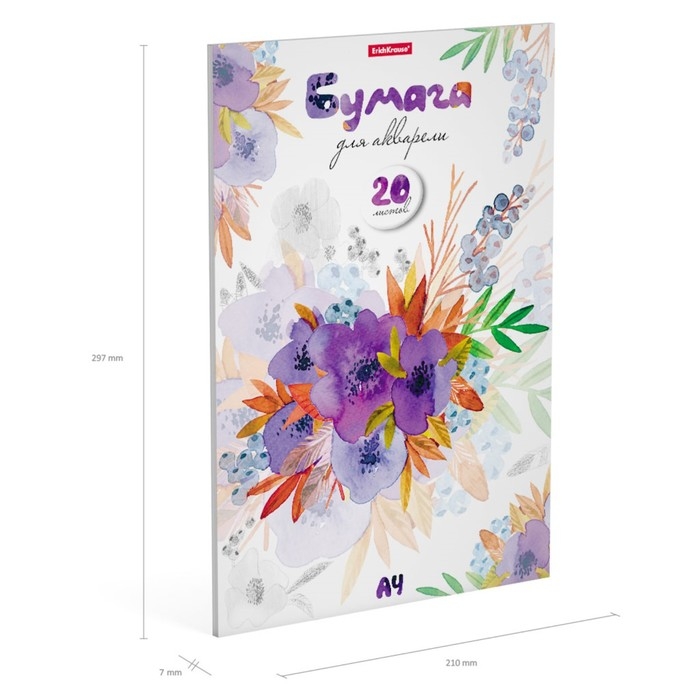Альбом для акварели А4, 20 листов, блок 180 г/м², на клею, Erich Krause "Нежный букет", экстра белая, твердая подложка