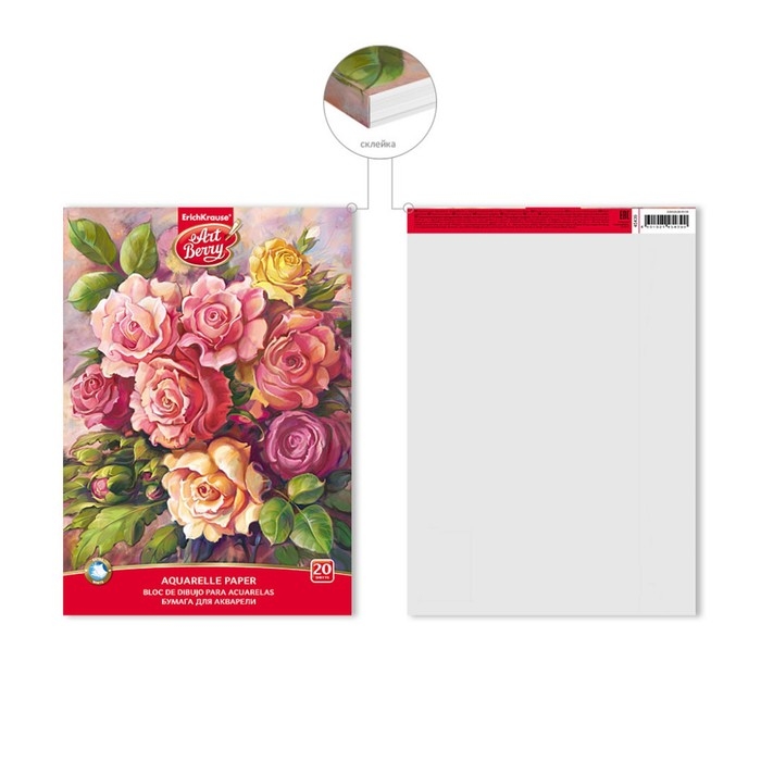 Альбом для акварели А4, 20 листов на клею, Erich Krause ArtBerry "Розы", блок 180 г/м², экстра белая, твёрдая подложка