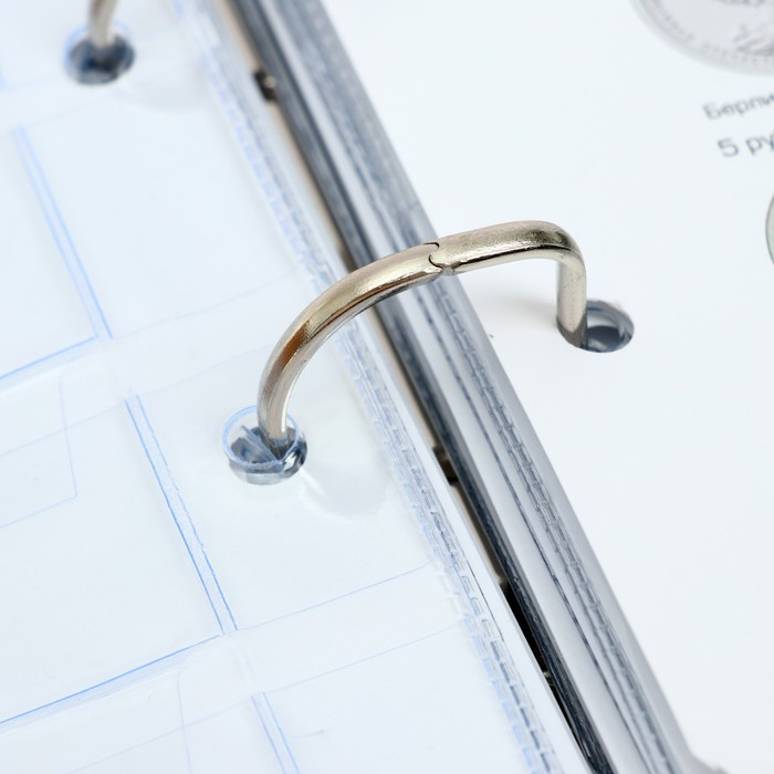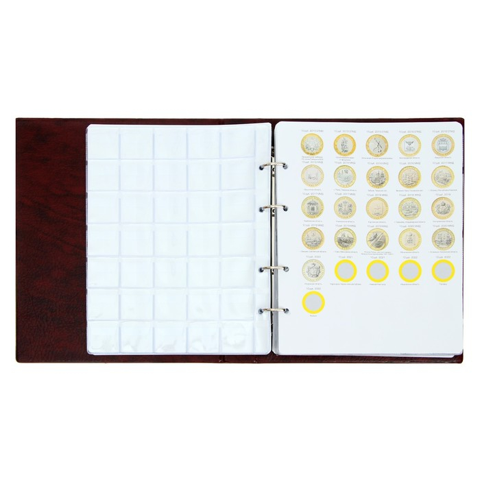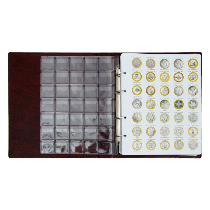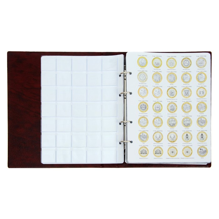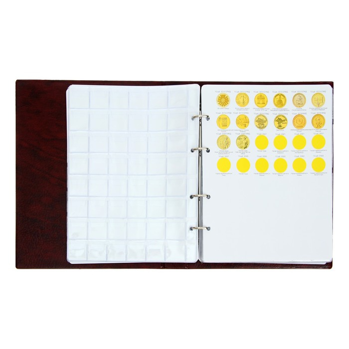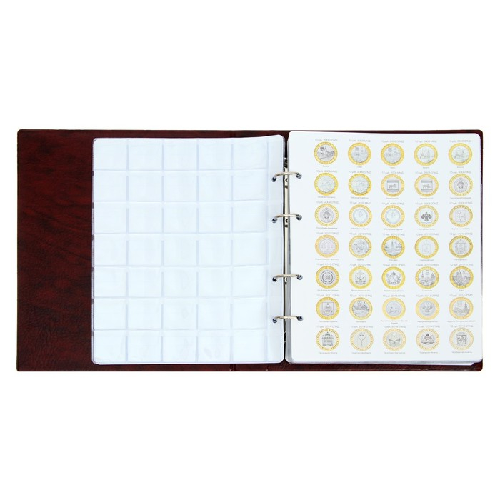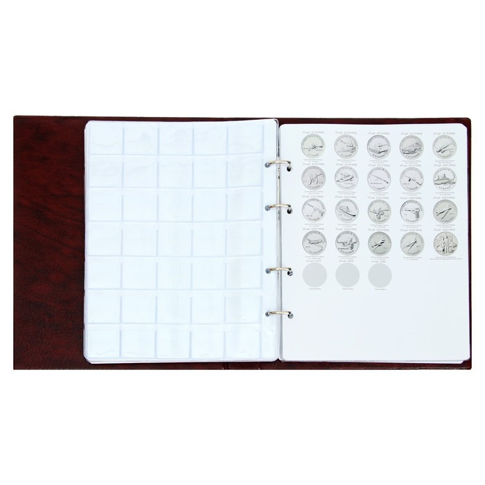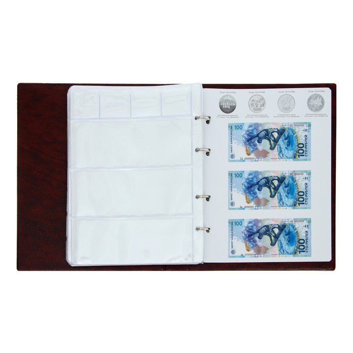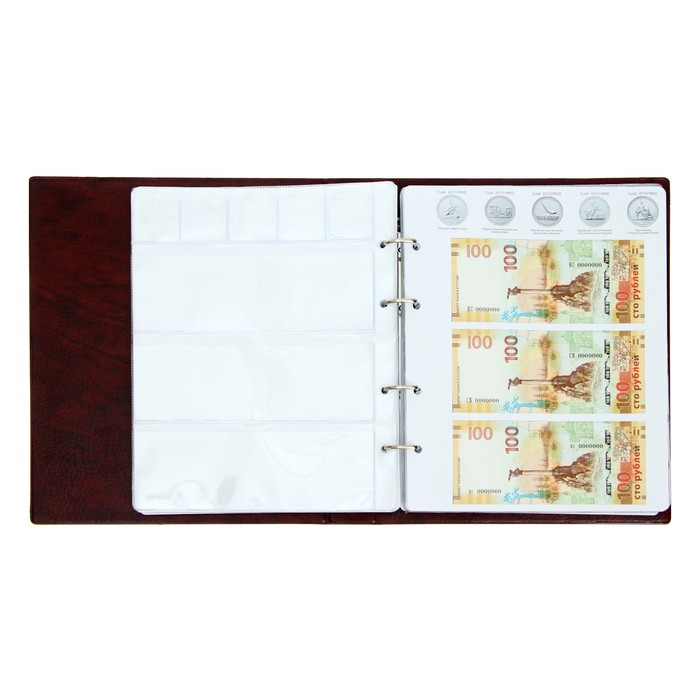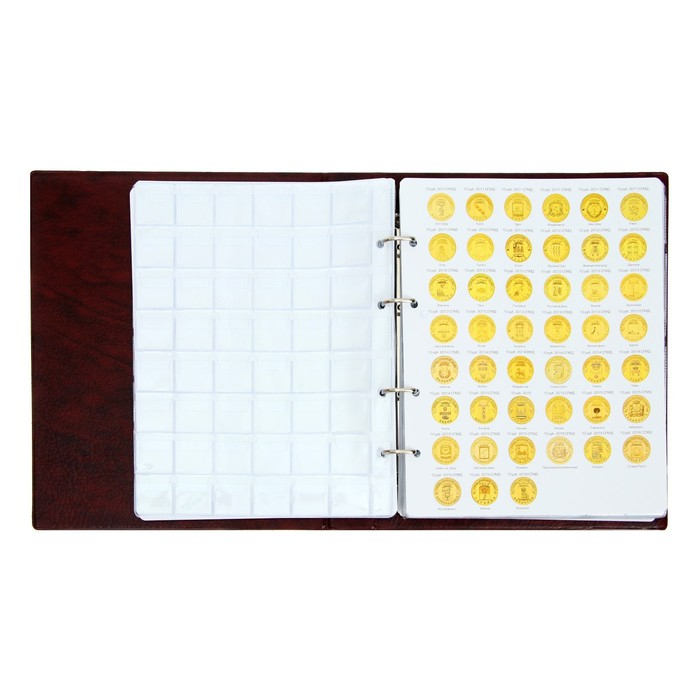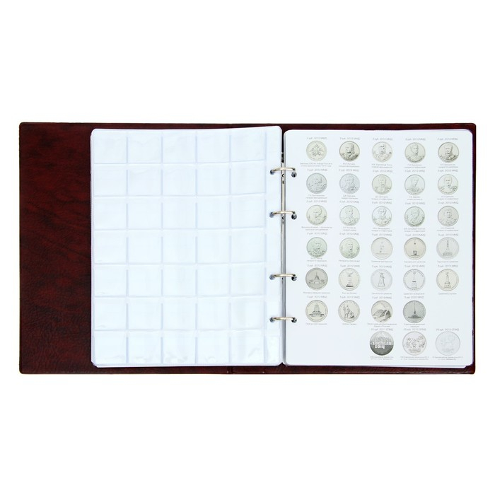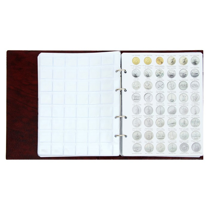 Альбом для монет на кольцах 225 х 265 мм, "Памятные монеты РФ", обложка искусственная кожа, 13 листов и 13 цветных картонных вставок, коричневый