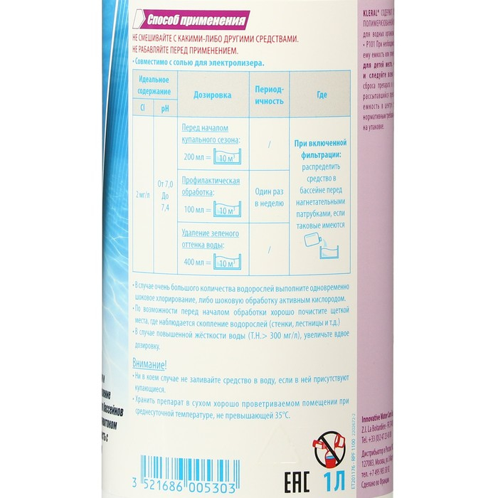 - Внести препарат в воду из расчета 1 литр на 25 куб. м. воды. При высокой засоренности водорослями провести одновременно ударную обработку быстро растворяющимся хлорным препаратом, который вы применяете при регулярной обработке (предварительно установить уровень рН между 7.0 и 7.4):