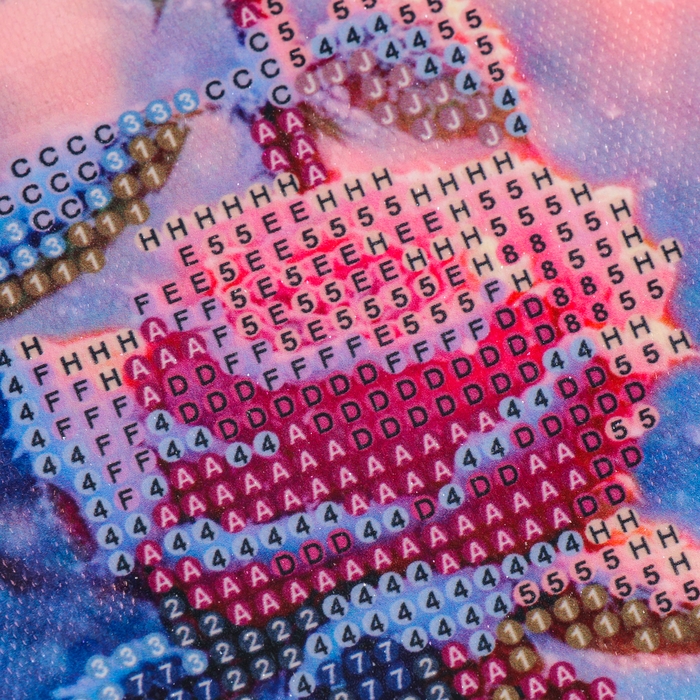 Разложите стразы с помощью карандаша по указанной схеме, заполнив полотно. Тканевая основа с точечным клеевым покрытием будет надёжно удерживать стразы. На картине уже обозначены необходимые оттенки, а цветовая таблица расположена рядом с рабочей областью холста.