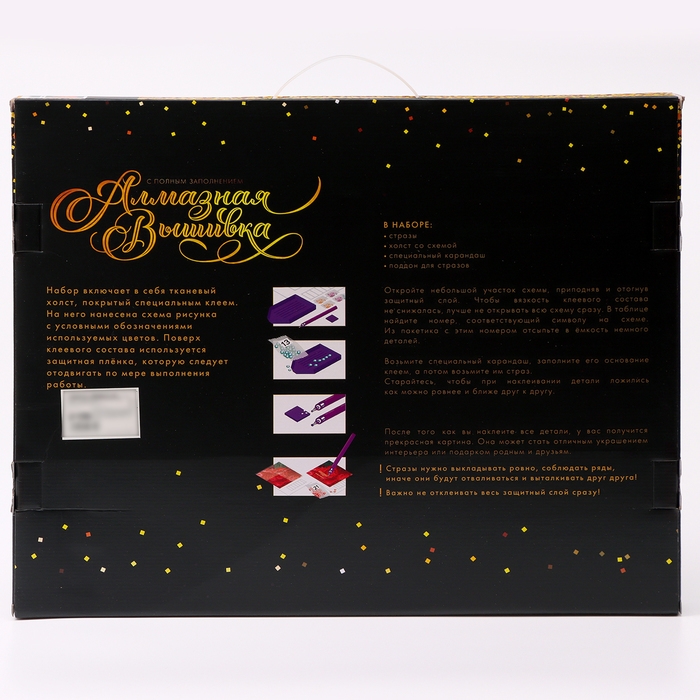 Вам предстоит разложить кристаллики карандашом по пронумерованной схеме. Холст с клеевым покрытием будет надёжно удерживать стразы.