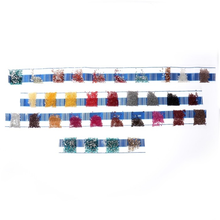 Разложите кристаллики с помощью карандаша по указанной схеме, заполнив полотно. На картине уже обозначены необходимые оттенки. Холст с клеевым покрытием будет надёжно удерживать стразы.