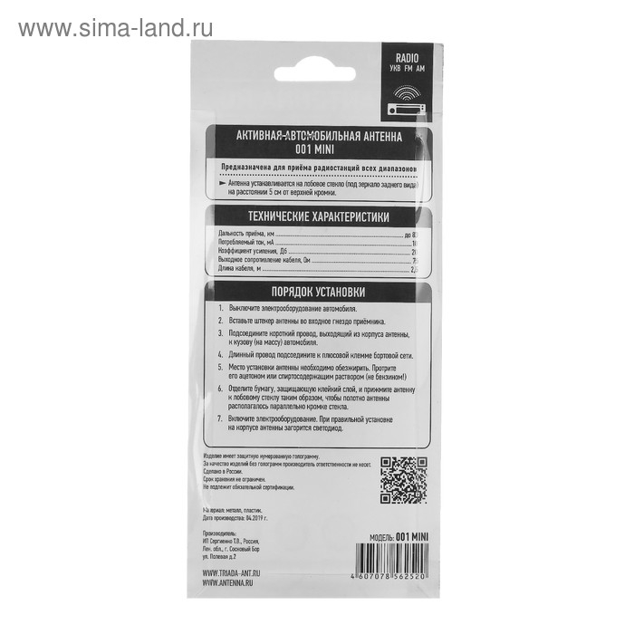 Предназначена для приема радиоволн УКВ, FM в условиях города. Основное преимущество – компактная конструкция и небольшая цена. Хорошо работает на небольших расстояниях от радиовещательных станций. Рекомендуется потребителям, эксплуатирующим автомобиль в основном в пределах города, которые не хотят переплачивать. Если требуется регулировать усиление для уменьшения промышленных и радиопомех вблизи от передающих станций, советуем обратить внимание на антенны ""Триада-002 Mini"".