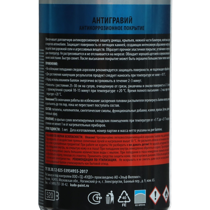 Антигравий KUDO обеспечивает долговечную антикоррозионную защиту днища, крыльев, нижней части бамперов, колесных арок и порогов автомобиля. Защищает поверхность от летящих камней, создающих интенсивную абразивную нагрузку, воздействия дорожной соли и агрессивных веществ.