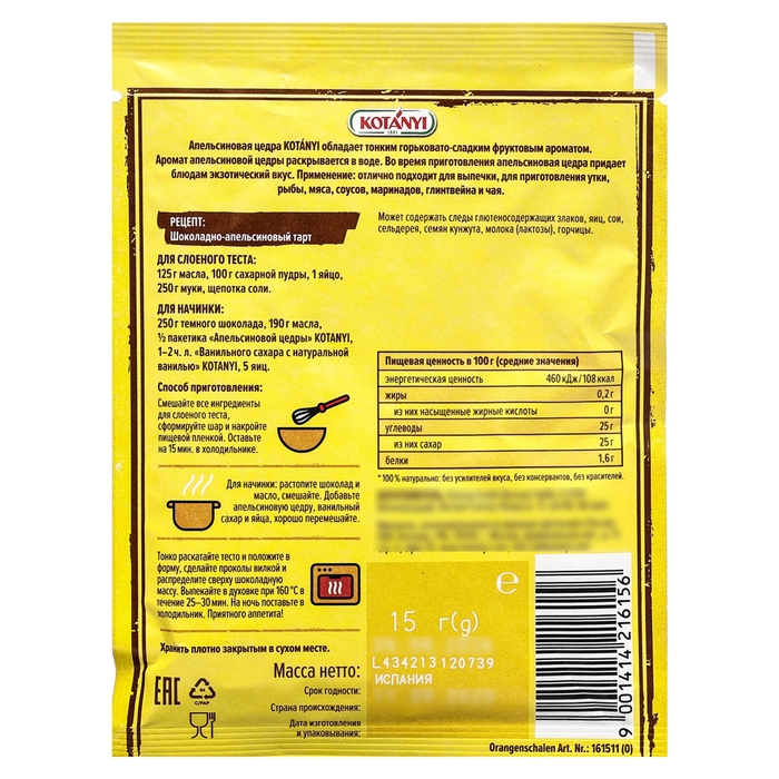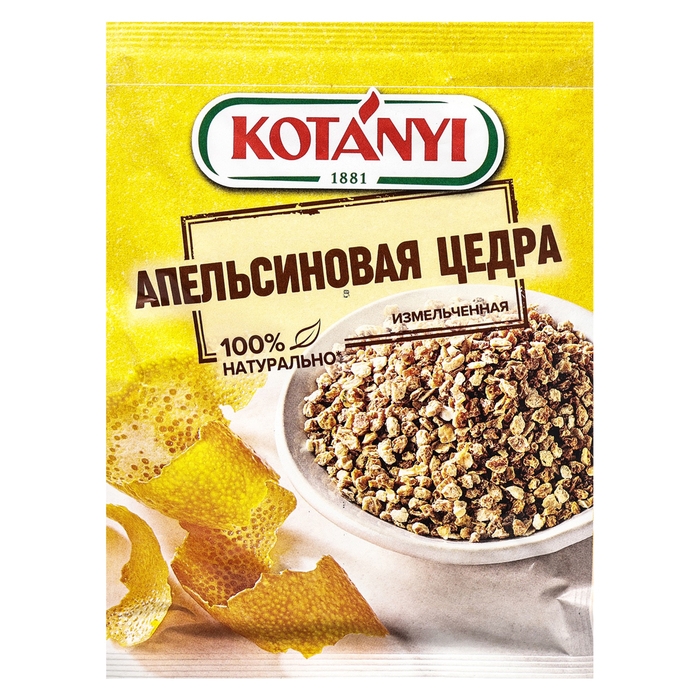 Апельсиновая цедра измельченная от Kotányi отличается благородным экзотическим, горьковато-сладким и фруктовым ароматом. Она придает напиткам аромат свежести. Цедра обладает ароматом, идеально подходящим для выпечки, утки, рыбы, мяса, соусов, маринада, глинтвейна и чая.