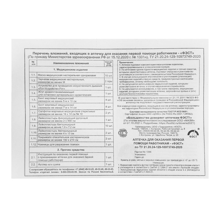 Аптечка первой помощи "ФЭСТ" для оснащения промышленных предприятий, футляр-полистирол, №7.1