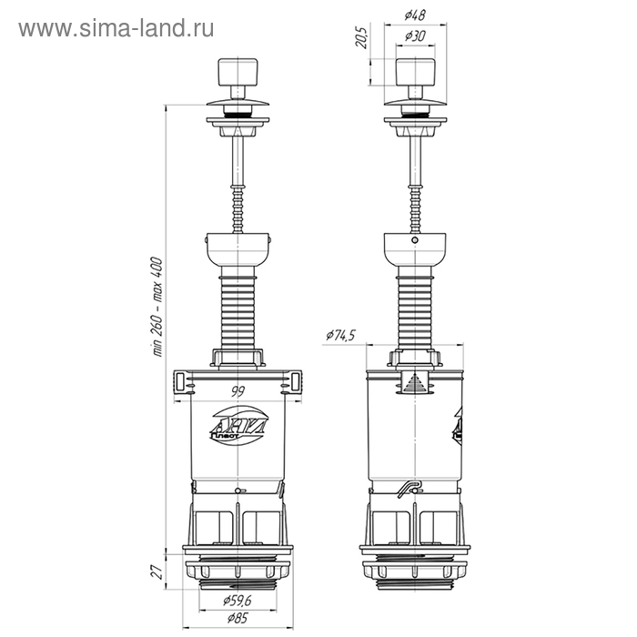 Арматура для смывных бачков "АНИ Пласт" WC7040М, металлизированный шток