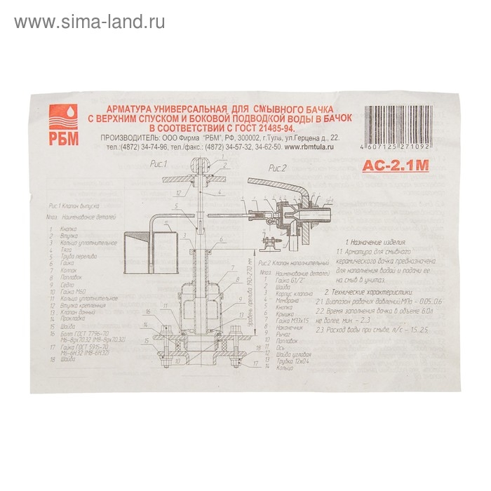 Арматура для смывных бачков "РБМ" АС-2.1 М, с боковым мембранным клапаном, хром