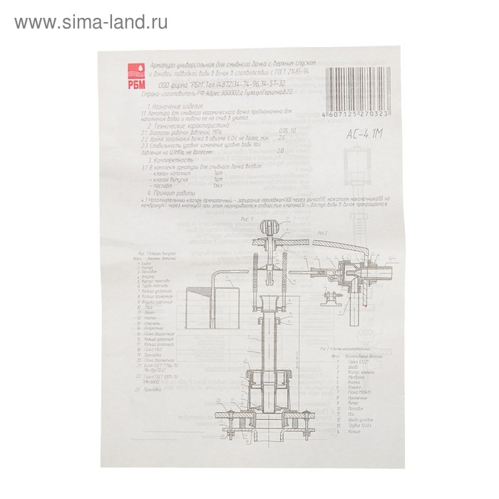 Арматура для смывных бачков "РБМ" АС-4.1 М, с боковым мембранным клапаном, хром