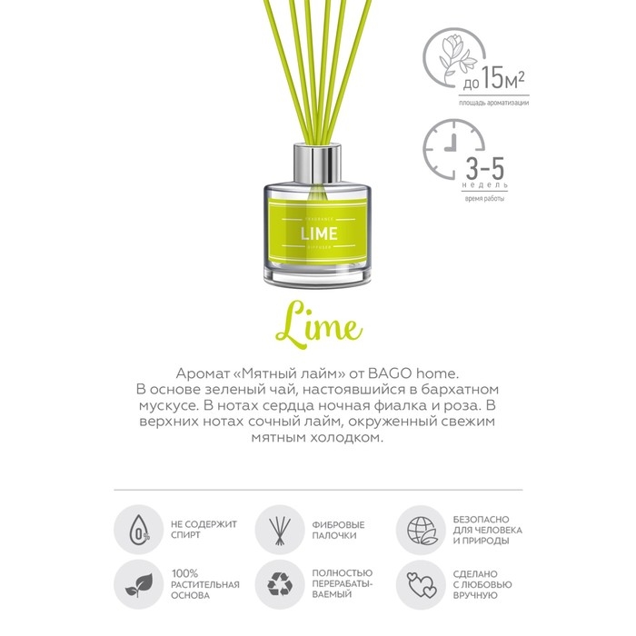 Ароматический диффузор "Мятный лайм" от BAGO home – это воплощение свежести и прохлады, идеально подходящее для создания освежающей атмосферы в вашем доме. С его помощью вы можете мгновенно преобразить любое пространство, добавив нотки кислого лайма и мятного холодка. Салатовый цвет диффузора дополняет визуальное восприятие аромата, а 4 недели работы и площадь ароматизации в 15 м2 обеспечивают длительное наслаждение ароматом.