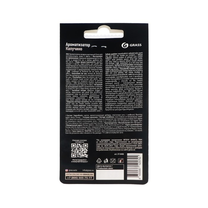 Ароматизатор Grass с ароматом капучино представляет собой компактный картонный подвесной блок с перфорированной поверхностью. Он предназначен для установки в автомобиле, офисе или любом другом помещении, чтобы создать приятную атмосферу и наполнить воздух нежным ароматом ванили.