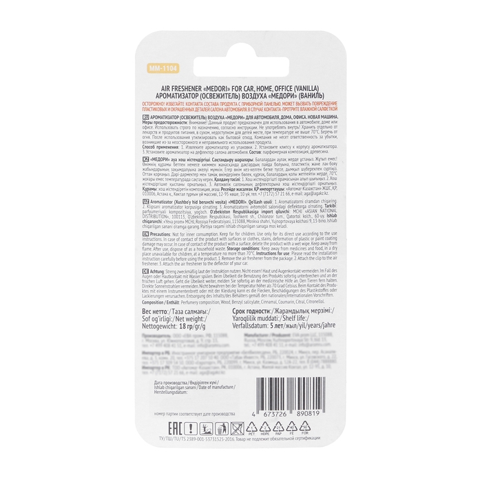 Ароматизатор Medori выполнен из натурального дерева, что придает ему особый шарм и делает его отличным дополнением к интерьеру любого автомобиля. Благодаря компактным размерам и легкому весу, ароматизатор не мешает обзору и не занимает много места. Ванильный аромат – это классический выбор для ароматизатора, который наполняет салон приятным и нежным запахом. Этот ароматизатор обладает средней интенсивностью аромата, что позволяет сохранять приятный запах на протяжении длительного времени.
