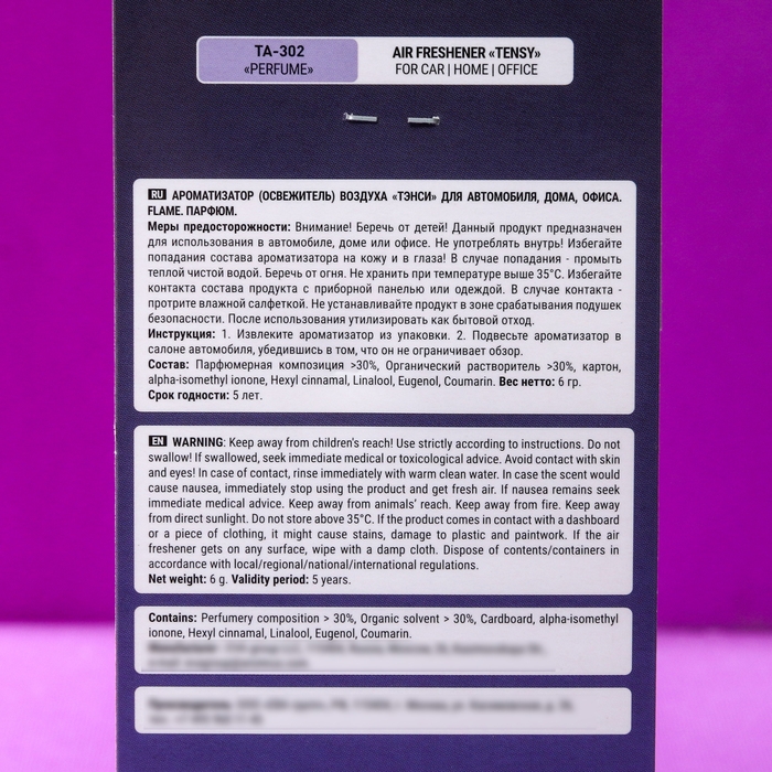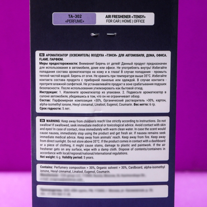 Подвесной ароматизатор Tensy "Парфюм" легко устанавливается на зеркало заднего вида или в любое другое удобное место в салоне автомобиля. Он не только украсит ваше транспортное средство, но и обеспечит комфорт и хорошее настроение во время поездки.