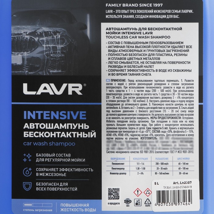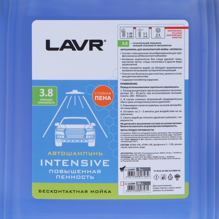 Автошампунь LAVR INTENSIVE бесконтактной мойки, повышенная пенность(1:30-1:50), 5 л Ln2307