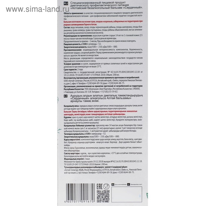 Бальзам Altay Seligor, сердечный, 200 мл.