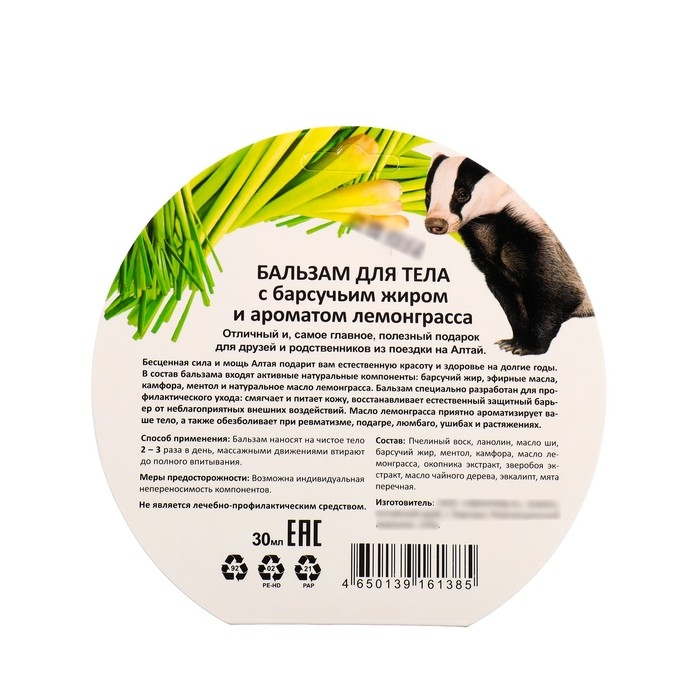 Подарочный БАЛЬЗАМ ДЛЯ ТЕЛА с барсучьим жиром и ароматом лемонграсса, 30 мл.