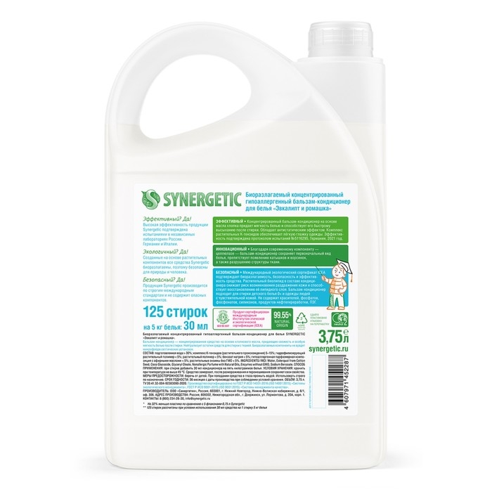 Биоразлагаемый концентрированный гипоаллергенный бальзам-кондиционер для белья SYNERGETIC с нежным ароматом "Эвкалипт и ромашка" на основе масла хлопка придает белью мягкость и способствует его быстрому высыханию после стирки. Средство нейтрализует остатки средств для стирки на ткани, помогает сохранить структуру ткани, защищая волокна от изнашивания и повреждения. Подходит для ручной и машинной стирки, для всех типов ткани, в том числе деликатных, таких как шерсть и шелк. Средство обладает антистатическим эффектом, а содержащийся в нем комплекс растительных К-тензидов обеспечивает легкую глажку одежды. Благодаря современному инновационному компоненту - целлюлазе - бальзам-кондиционер помогает сохранить первоначальный вид белья, препятствует появлению катышков и ворсинок, а также разрушению структуры ткани, возвращая яркость цветам и гладкость волокнам. Растительный биолипид в составе кондиционера снижает риск возникновения раздражения кожи и способствует восстановлению ее липидного слоя. Бальзам-кондиционер подходит для стирки детского белья 0+ и одежды людей с чувствительной кожей. При стирке добавить 30 мл кондиционера на пять килограммов белья. Хранить отдельно от пищевых продуктов, в местах, недоступных для детей и животных. Использовать строго по назначению. Не употреблять внутрь. Избегать попадания в глаза и на поврежденные участки кожи. В случае попадания обильно промыть водой и обратиться за медицинской помощью. При проглатывании немедленно обратиться за медицинской помощью и предъявить упаковку средства. При повышенной чувствительности и повреждениях кожи избегать длительного контакта со средством. Подготовленная вода > 30%; А-тензиды (ПАВ из растительного масла) 5–15%; Н-тензиды (ПАВ из растительного масла) < 5%; глицерин < 5%; зелёный хелат < 5%; растительные антиресорбенты < 5%; ингибитор переноса красителей < 5%; био-энзимы без ГМО < 5%; морская соль < 5%; гипоаллергенная парфюмерная композиция с эфирными маслами < 5%; консерванты < 5%.
