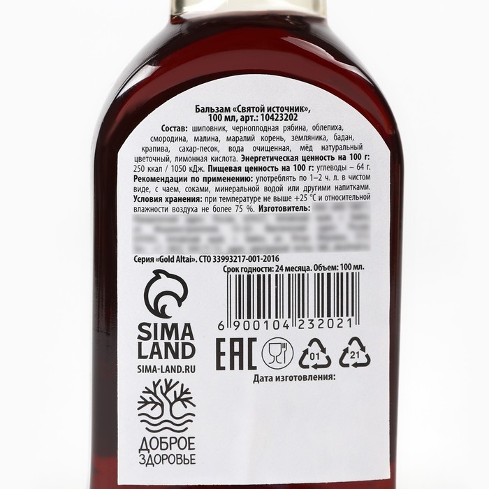 Состав: шиповник, черноплодная рябина, облепиха, смородина, малина, маралий корень, земляника, бадан, крапива, сахар-песок, вода очищенная, мёд натуральный цветочный, лимонная кислота.