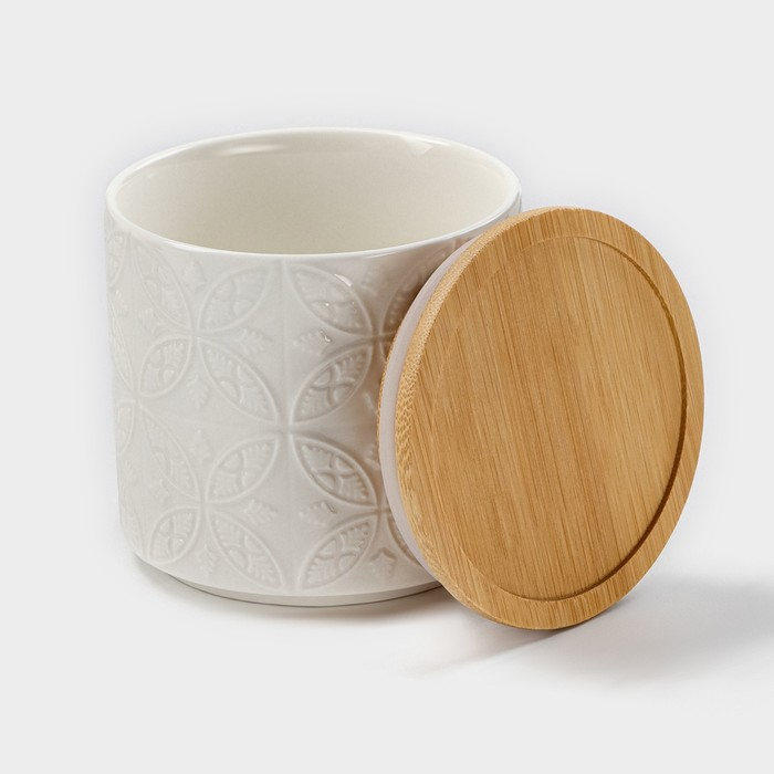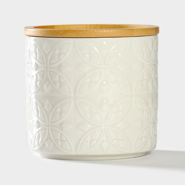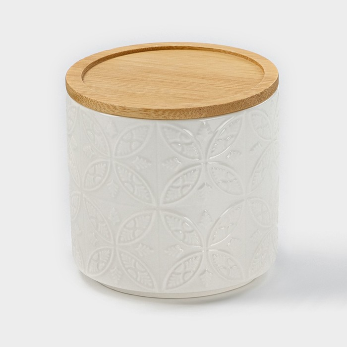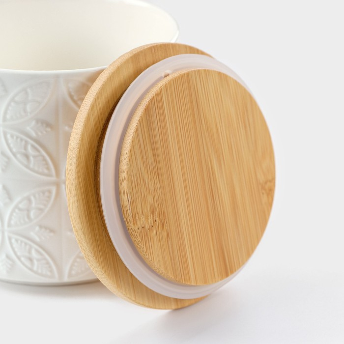 Банка для хранения сыпучих продуктов BellaTenero «Листья», 300 мл, d=8,5 см, с бамбуковой крышкой, фарфоровая, цвет белый