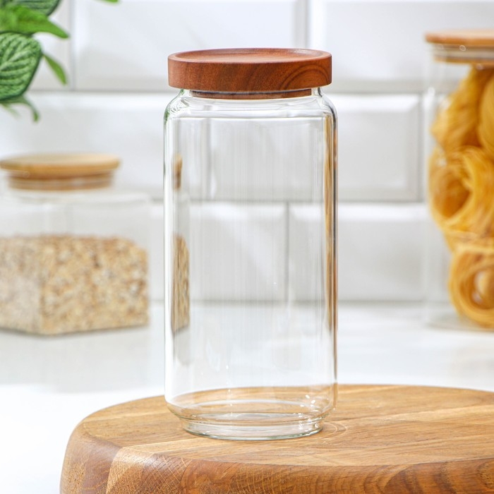 Стеклянная банка премиального качества для хранения круп, специй, сыпучих и других пищевых продуктов. Банка стеклянная с крышкой прекрасный вариант хранения на кухне. Крышка из дерева позволяет плотно закрывать банку и препятствует проникновению влаги и посторонних запахов.