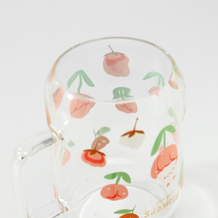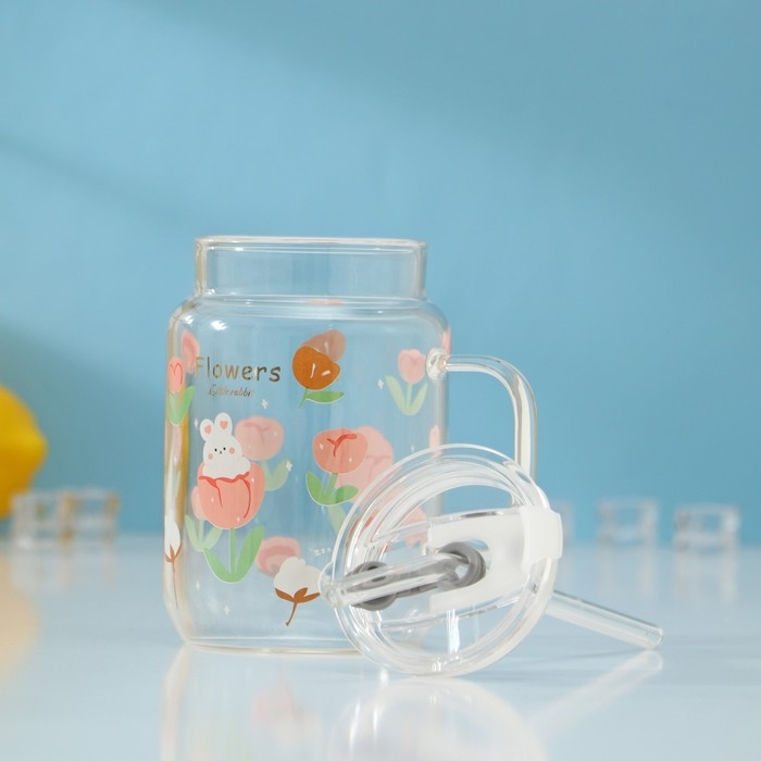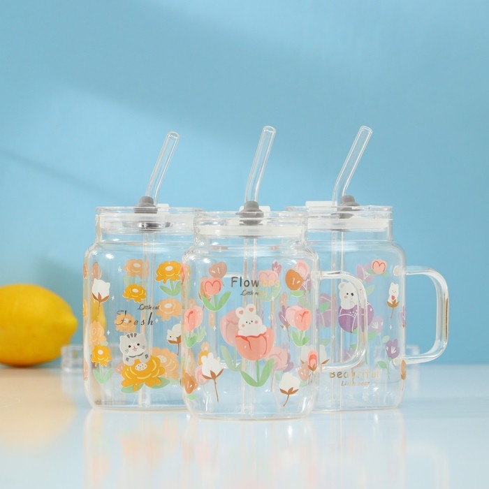 Кружка стеклянная Доляна «Котик», 450 мл, 10×7,5×13 см, с ручкой, крышкой и трубочкой