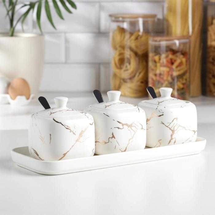 Банки для хранения сыпучих продуктов с ложками на подставке Gold, 3 предмета: 460 мл, 9,5×9,5 см, керамические, цвет белый