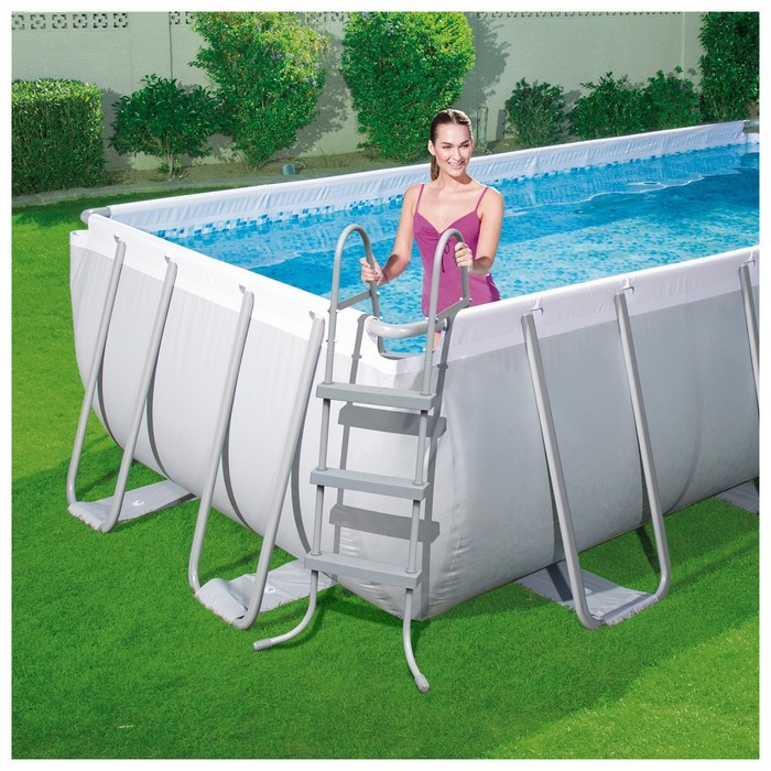 В комплекте к бассейну входят: песчаный фильтр-насос, лестница, диспенсер.