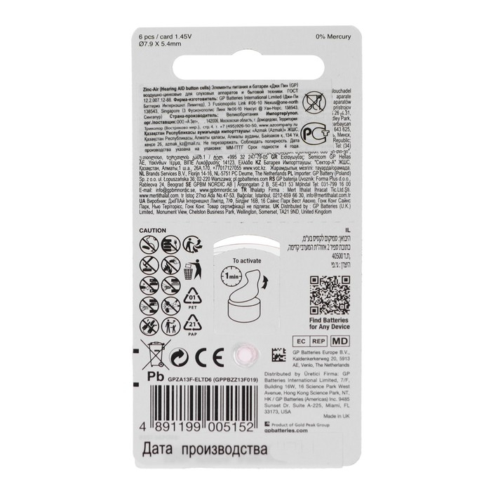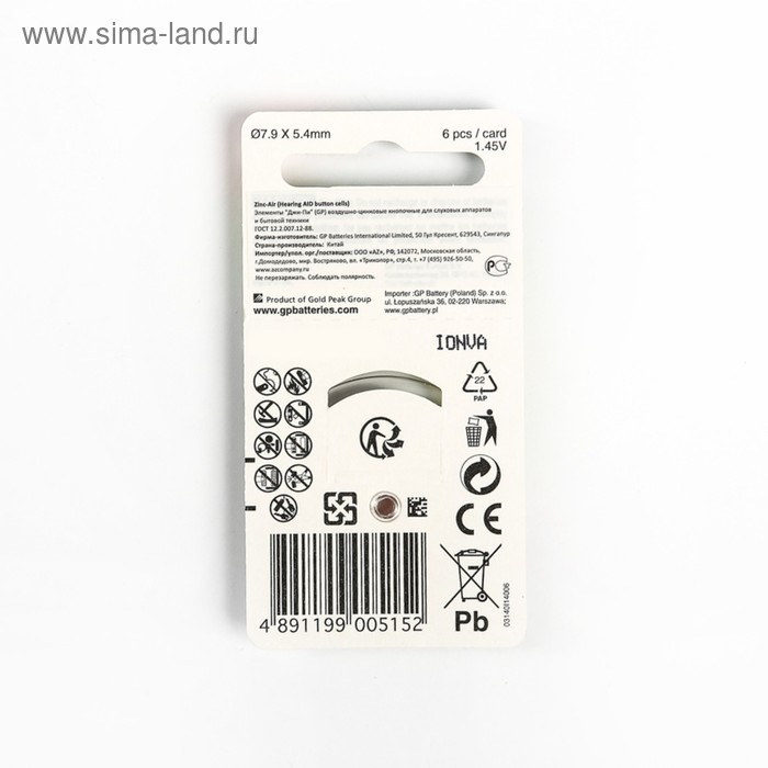 Батарейка цинковая GP, ZA13 (PR48)-6BL, для слуховых аппаратов, 1.45В, блистер, 6 шт.
