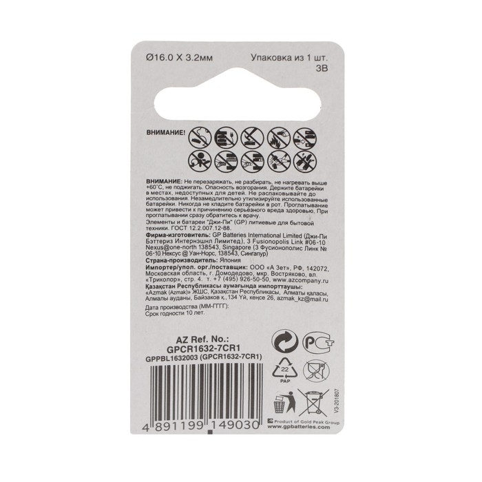 Батарейка литиевая GP, CR1632-1BL, 3В, блистер, 1 шт.