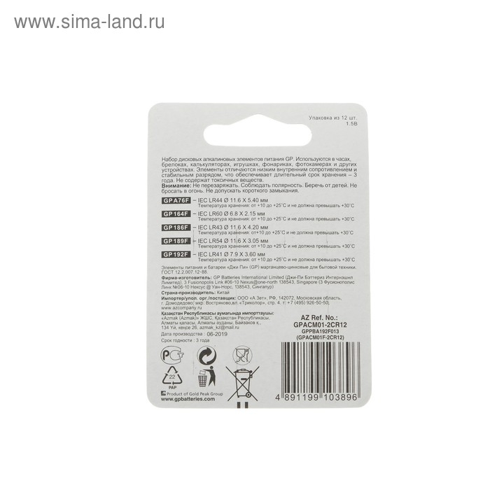 Батарейки алкалин GP, LR44(A76)-4шт,LR60(164)-2шт,LR43(186)-2шт,LR54(189)-2шт,LR41(192)-2шт