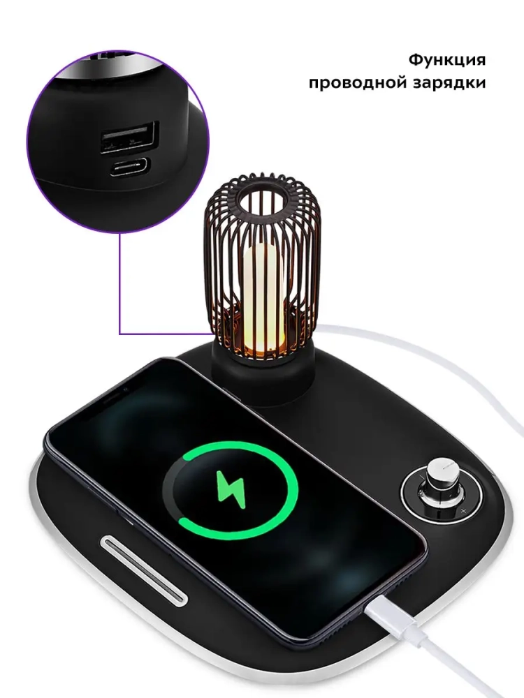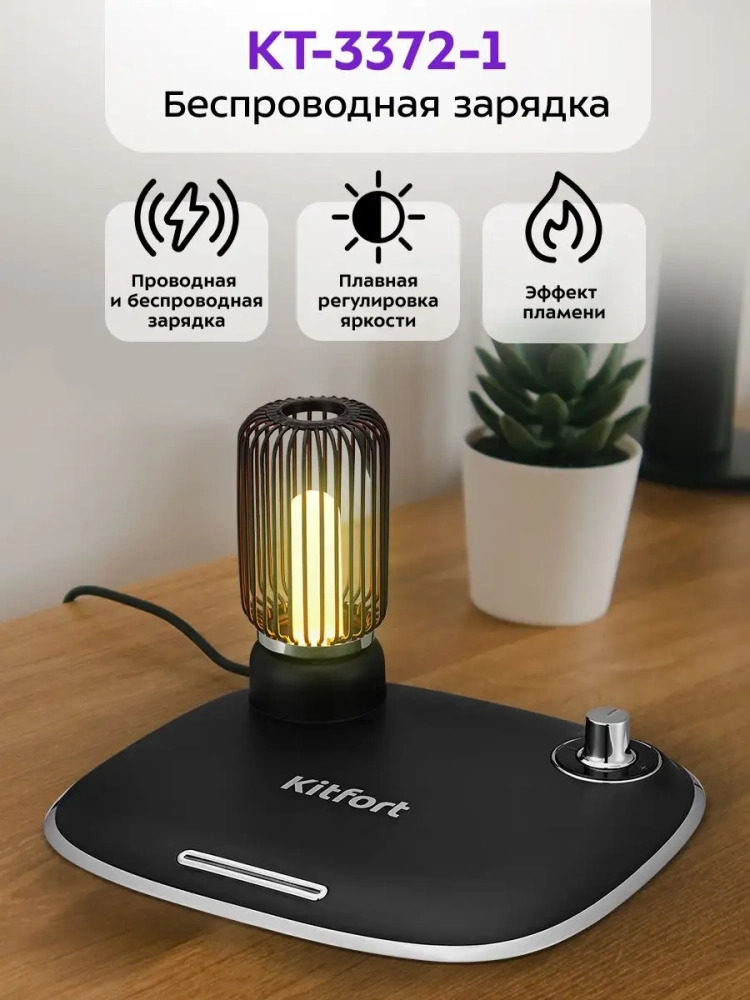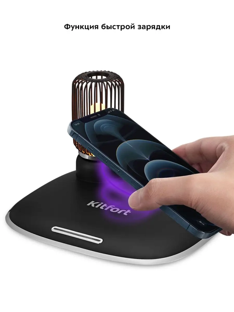 Беспроводная зарядка Kitfort КТ-3372 позволяет с легкостью заряжать телефон, часы или другие устройства, если они поддерживают функцию беспроводной зарядки. Устройство работает по стандарту Qi для индукционной передачи энергии. Многие современные смартфоны и умные часы поддерживают стандарт беспроводной зарядки Qi. Также у беспроводной зарядки есть порт USB, для зарядки устройств, не поддерживающих беспроводную зарядку, проводным способом. Вы можете использовать беспроводную зарядку как ночник, благодаря мягкому теплому свету светильника. У светильника есть плавная регулировка яркости и возможность включить эффект пламени.