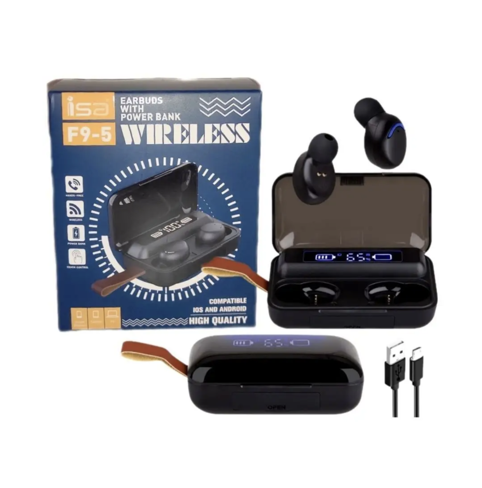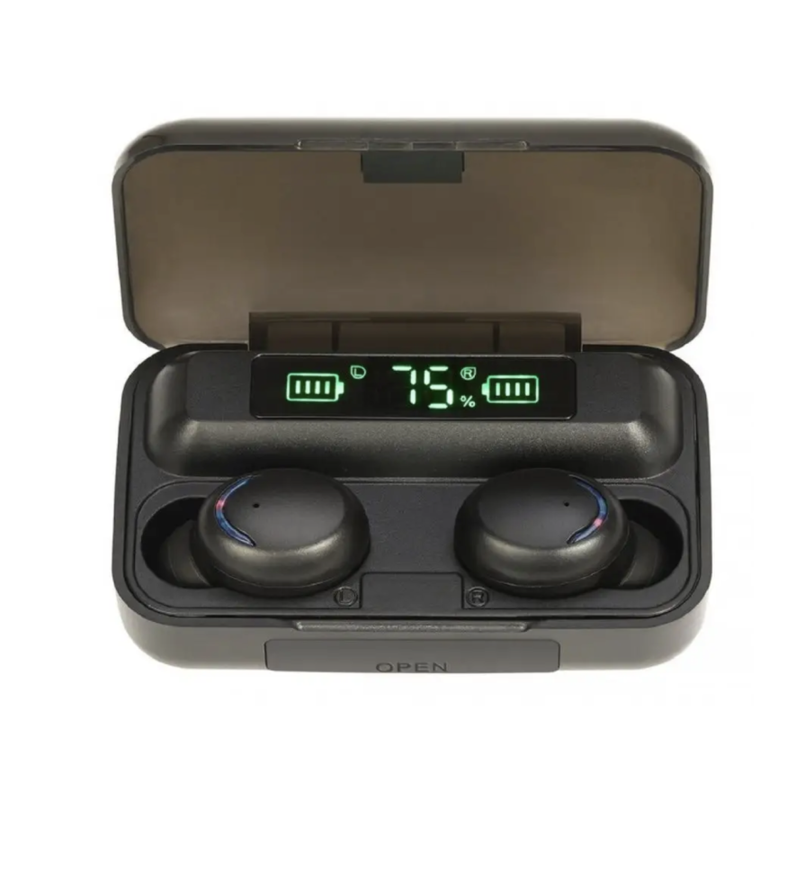 Наушники беспроводные черные isa F9-5 с цифровым LED дисплеем, отображающим уровень заряда аккумулятора индикацией заряда каждого из наушников. Кейс для наушников имеет функцию подзарядки мобильного телефона - павер банк (мощность - 2000 мАч), что очень удобно в путешествии или когда срочно нужно подзарядить мобильный телефон. На футляре беспроводных наушников есть два порта USB и micro USB. Кейс гарнитуры - это прекрасная подставка для мобильного телефона. Можно смотреть любимый фильм или сериал удобно расположив блютуз наушники на подставке, в то время как вы заряжаете его при этом наслаждаться чистым качественным Hi-FI 9D звуком наушников. Наушники беспроводные оснащены современным блютуз модулем - Bluetooth 5.1. Обладают прекрасной совместимостью со всеми современными смарт устройствами Android и iOS, а также Windows и Linux благодаря чему они работают на любом смартфоне, ноутбуке, планшете, имеющем систему беспроводной связи Bluetooth. Беспроводные наушники работают в радиусе 10 метров от устройства к которому подключены, быстрое автоматическое сопряжение. Важно, чтобы в зоне действия блютуз сигнала не было препятствий для сигнала подавляющих его. Это может влиять на качество соединения. В каждом наушнике встроенный аккумулятор мощностью 50 мАч, что подарит вам до 5-6 часов беспрерывного звучания. Наушники можно заряжать от кейса до 10 раз, на едином заряде базы.