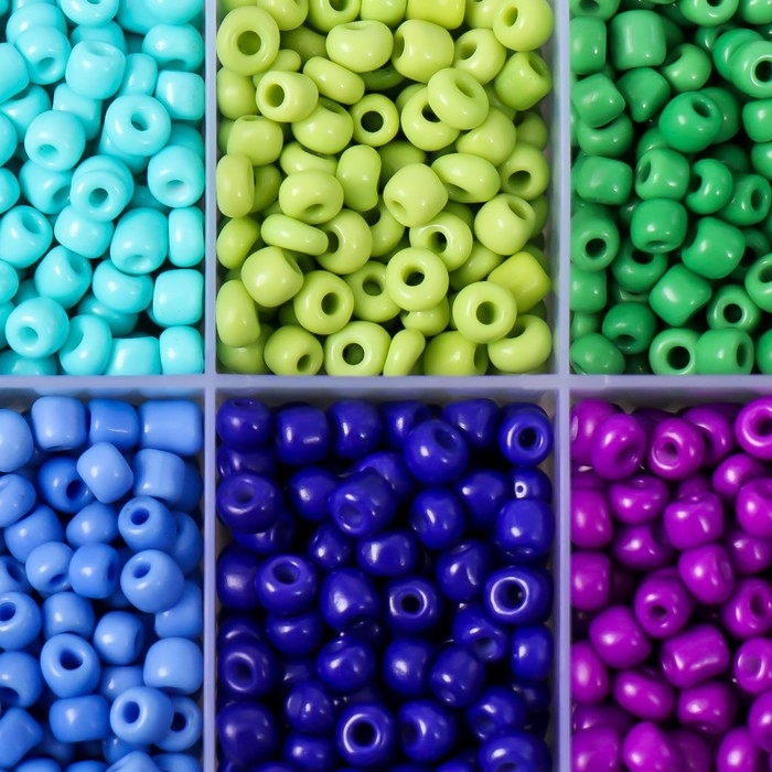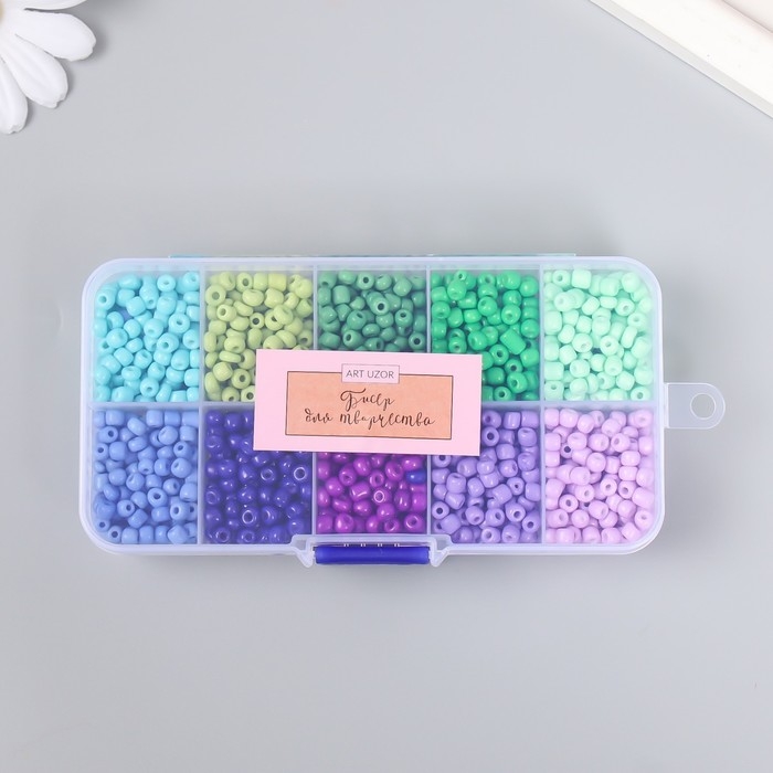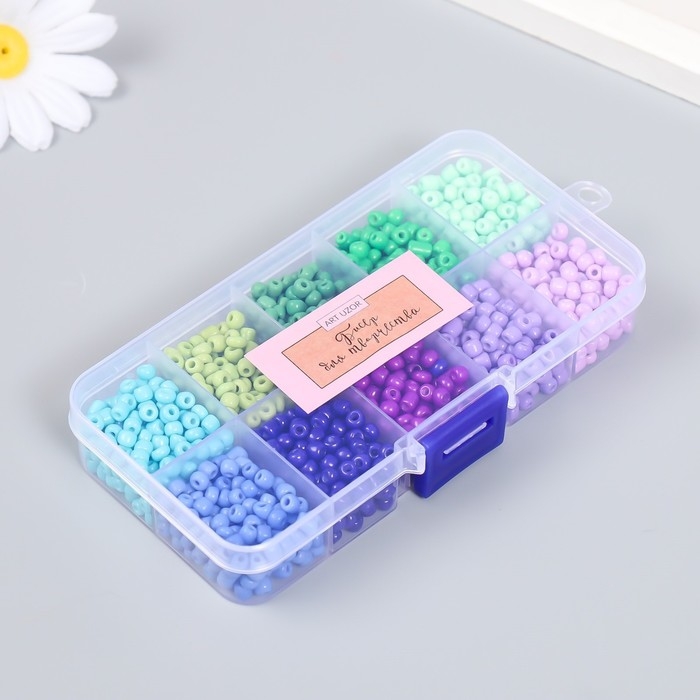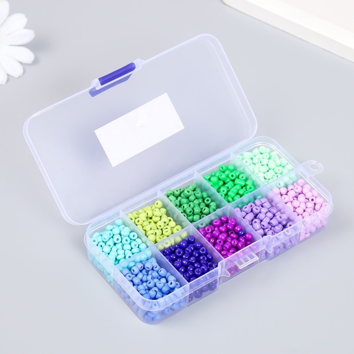 Бисер стекло 6/0 в шкатулке 10 делений "Сине-зелёный" 1 деление=10 гр 12,8х6,5х2,2 см