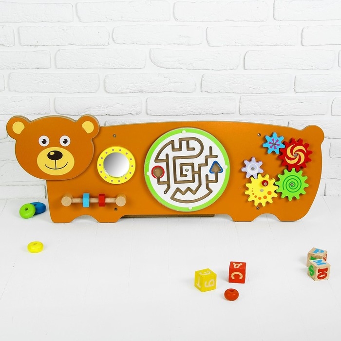 У логической доски множество поверхностей с разными играми в зависимости от модели. Есть крутящиеся кубики, лабиринт, серпантинка и шестерёнки, поверхность со вкладышами, сортер, счёты или музыкальные инструменты. А ещё он выполнен в виде дружелюбного персонажа, поэтому обязательно понравится ребёнку.