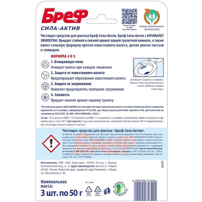 Бреф Сила-Актив с АНТИНАЛЕТ ЭФФЕКТ – подвесной туалетный блок с формулой против известкового налета.