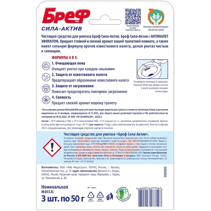 Бреф Сила-Актив с АНТИНАЛЕТ ЭФФЕКТ – подвесной туалетный блок с формулой против известкового налета.