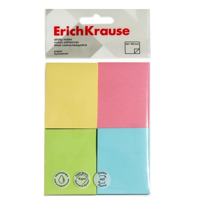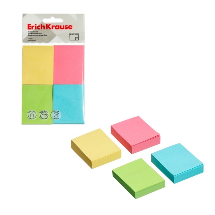 Блок с липким краем бумажный 40х50 мм, ErichKrause, 400 листов 4 цвета