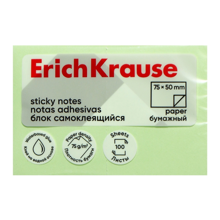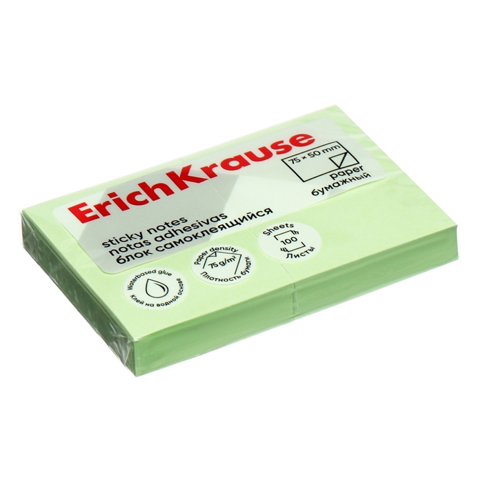 Блок с липким краем бумажный 75х50 мм, ErichKrause 100 листов, зеленый