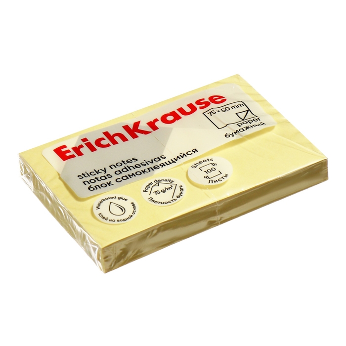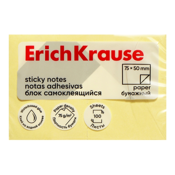 Блок с липким краем бумажный 75х50 мм, ErichKrause 100 листов, желтый