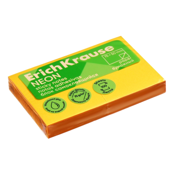 Блок с липким краем бумажный 75х50 мм, ErichKrause "Neon", 100 листов, оранжевый